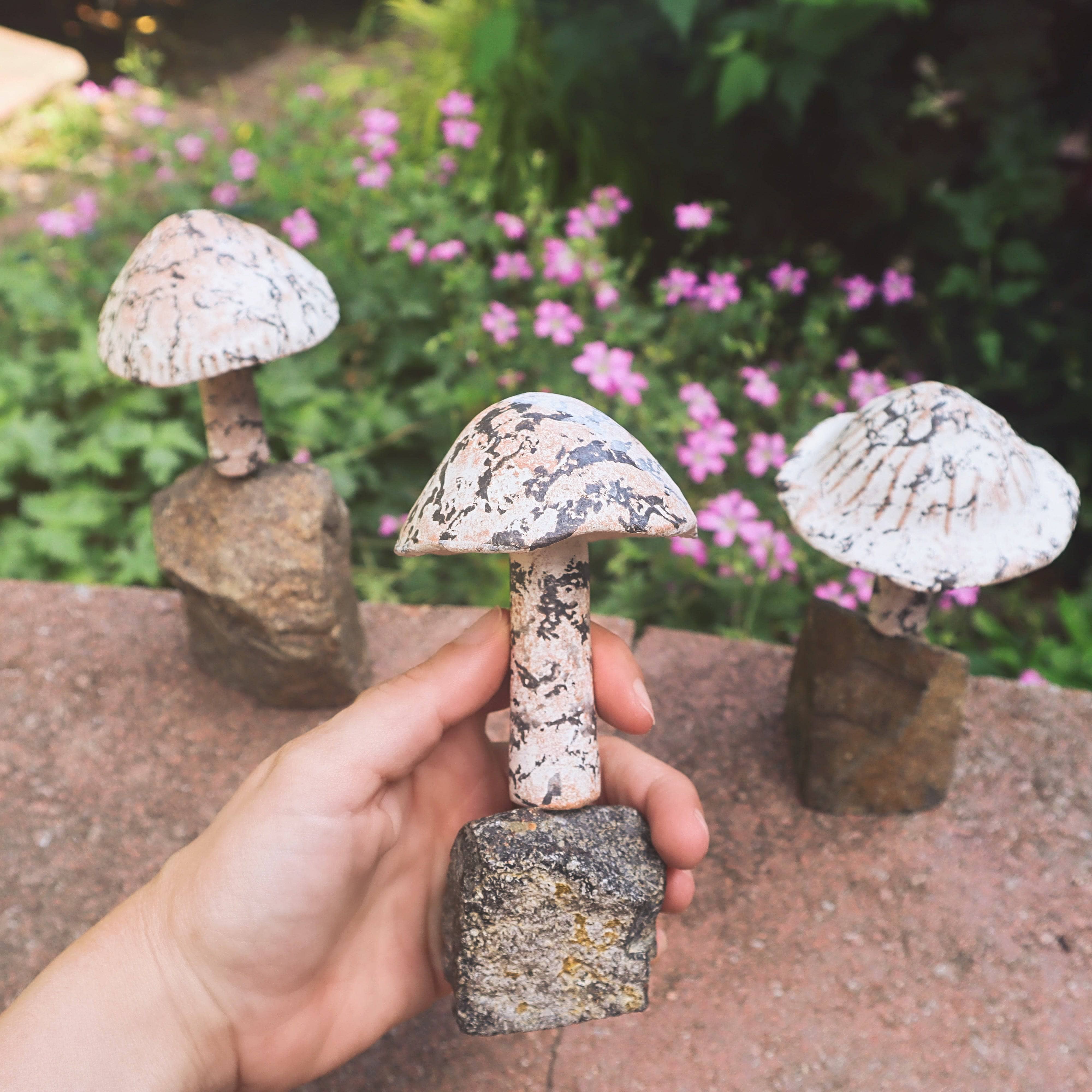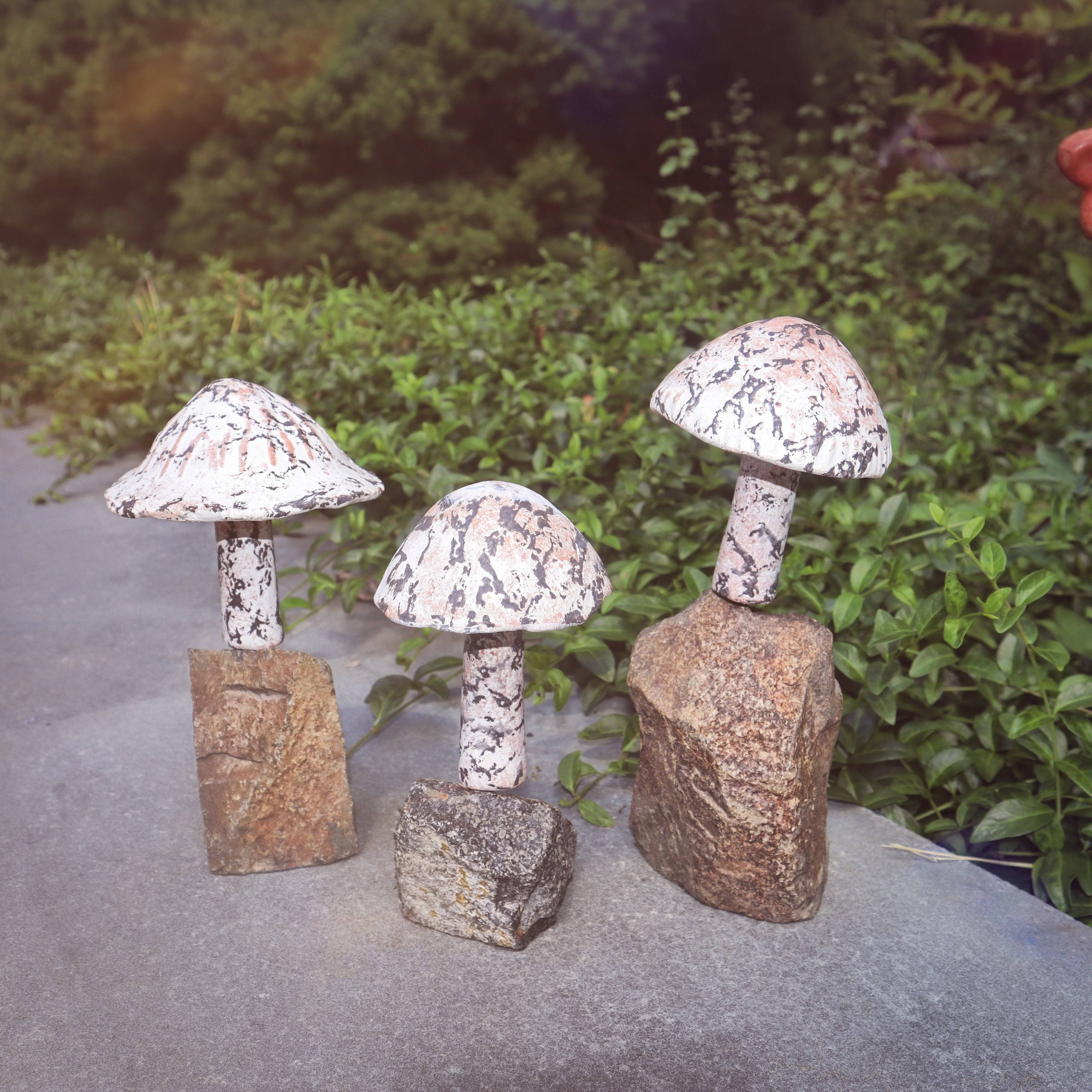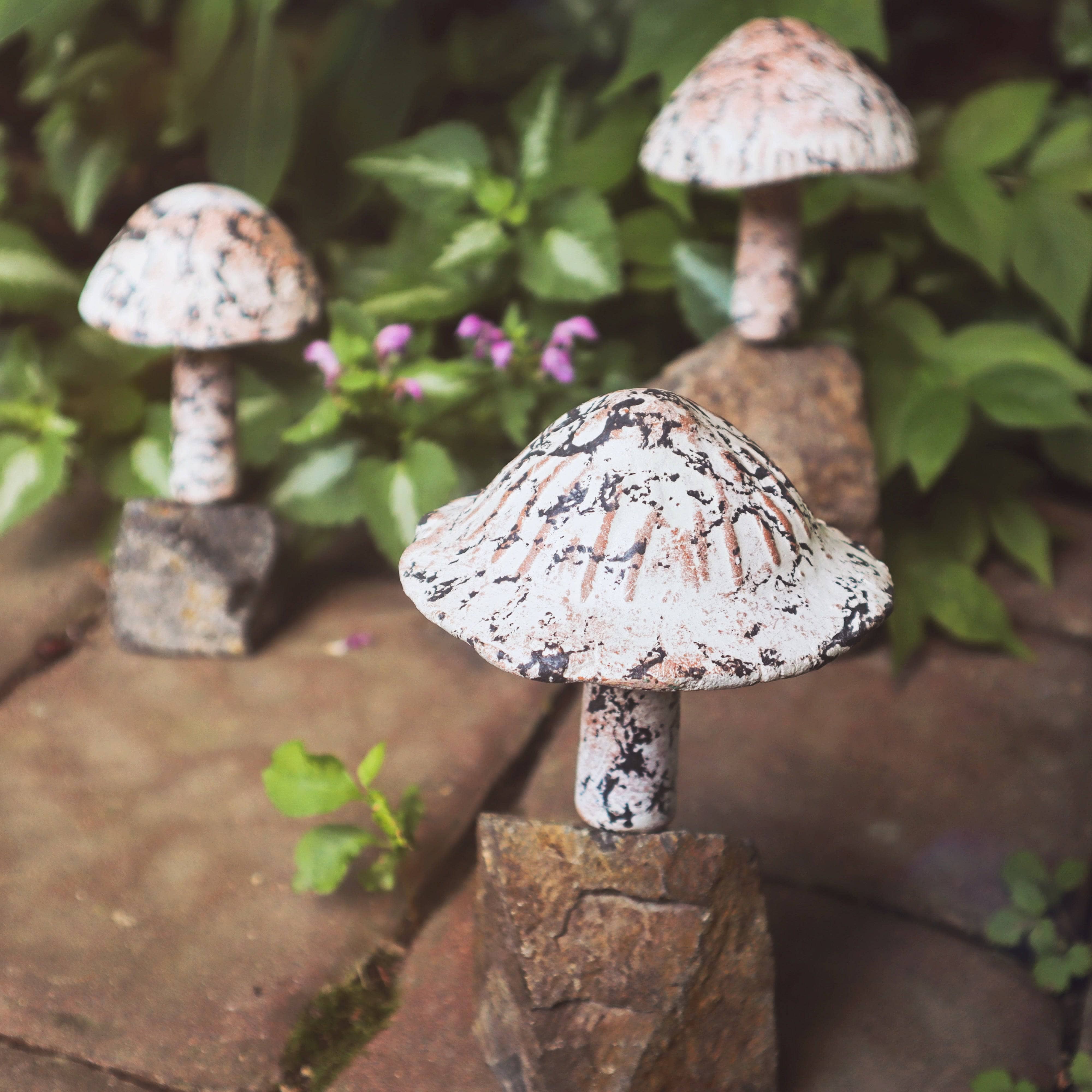Natural colors and textures make our Little Fungi on Stone sculptures a marvelous addition to any flowerbed or rock garden. In varying heights and finishes, they look very much like the real thing! At once whimsical and beautiful, these little mushroom sculptures are fantastic on their own or alongside other pieces. Like all happy Gardens sculptures, these are handcrafted, and bring lasting beauty to your landscape.